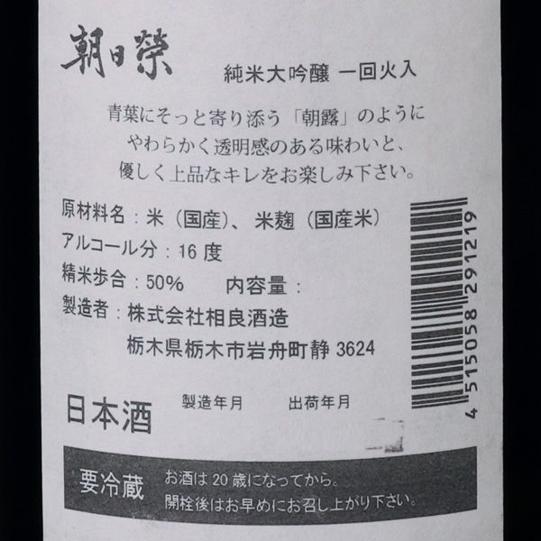 青葉にそっと寄り添う朝露のように透明感のある日本酒天保2年、1831年創業。現在では若くして蔵元杜氏となった相良沙奈恵氏を中心に酒造りが行われています。沙奈恵氏は東京農大卒業後、他の酒蔵で修業を積み、蔵に戻った翌年から杜氏の重責を担うことになりました。普通酒主体だった酒造りから吟醸造りへ大きく方向転換をし、日々研鑽を積む女性杜氏が醸すそのお酒は年々進化し続けています。代表銘柄「朝日榮」では、みずみずしい透明感と後味のキレが表現されており、食事にそっと寄り添ってくれるお酒です。