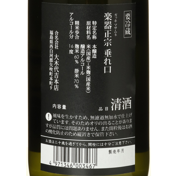 大好評の楽器正宗より新商品、垂れ口がリリース。通常より低圧で時間をかけてゆっくりと搾っています。ガス感はないものの、やさしく搾ったからこその柔らかい透明感が味わえます。白ワインのソーヴィニヨンブランを想起させる爽やかな香りも特徴的です。蔵紹介