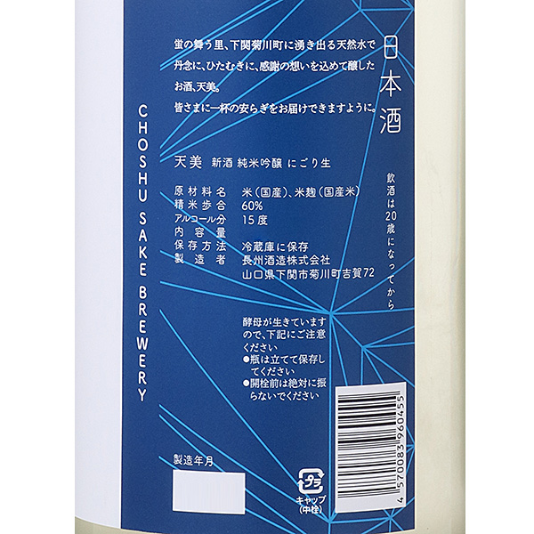 天美の定番、純米吟醸のにごり生原酒です。もろみが持つお米由来の旨味と仄かな甘味を併せ持つ天美らしいきめ細かなガス感と爽やかな酸味がアクセントになっています。華やかな甘みが口に広がり、キレの良い口当たりがクセになる最高の1本となっております。※開栓の際は栓が飛ぶ場合がございまので、天面を手のひらでおさえて、慎重にアルミを開栓してください。