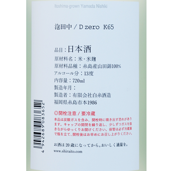 精米歩合65%、原酒でありながらもアルコール度数を13%に抑えた「田中六五 6513」を独自の製法で二次発酵を行っています。発泡はあまり強くなく、ドライでありながら、お米の優しい甘味が軽快に広がる味わいです。注意事項