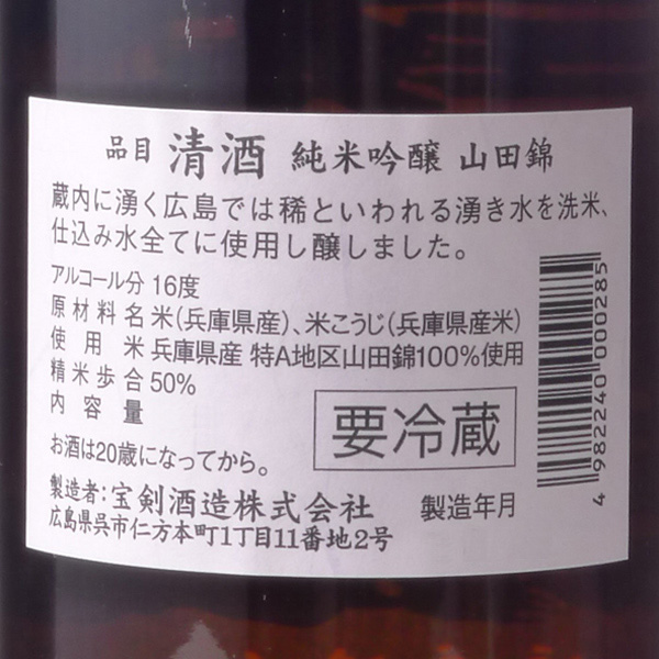 宝剣では数少ない山田錦を使ったライン。納得のいく山田錦で醸すため、兵庫県産特A地区の特上米を選んで使っています。約1年間低温で寝かせることにより、香味穏やかに仕上がっています。山田錦の持つポテンシャルを最大限に引き出し、きれいな酸と透明感のある旨味、落ち着きのある優しい甘みが調和しています。受賞歴