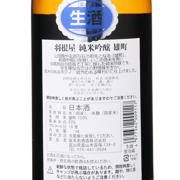 皆様のおいしいのために、蔵元の思いが溶け込んだお酒!大正5年創業。立山連峰の伏流水で主に富山県産の酒米を使用し、お酒を醸しています。5代目を継ぐ羽根敬喜さんが目指すのは飲めば自然と(蔵元の思いが)伝わる味。造りにおいては、すべてのお酒を大吟醸を醸すのと同じ気持ちで、一つ一つの工程を丁寧に、手間隙を惜しまずに造ることを大切に。近年ではIWC(インターナショナルワインチャレンジ)にてメダルを獲得。また、ANAプレミアムクラス・ビジネスクラスのお酒としても採用されています。