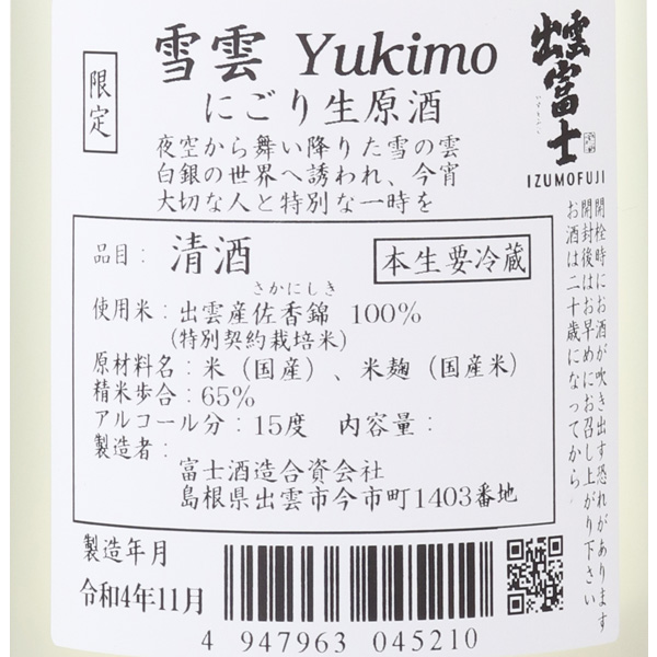 出雲富士 雪雲 YUKIMO にごり 生原酒 *クール便のみ