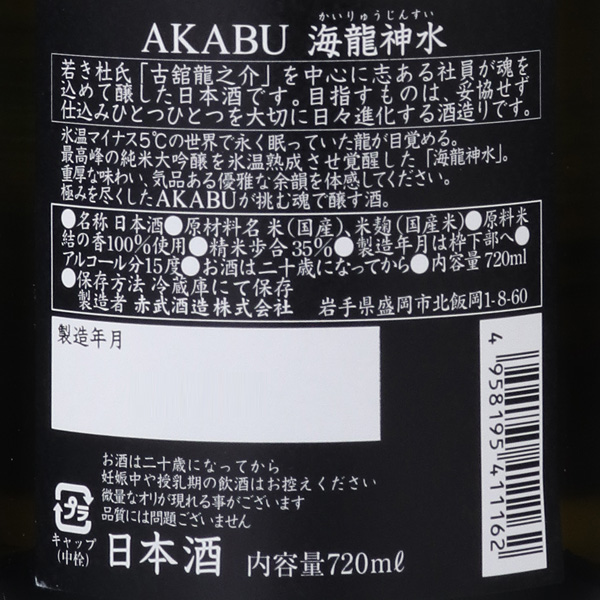 AKABU 『海龍神水』覚醒しました。これまでフレッシュ、鮮度に重点を置き、『フレッシュで綺麗な日本酒=AKABU』というイメージが浸透してきました。より新たな酒質を求め、数年前から『綺麗な酒質とより深い味わい』をテーマに適切な熟成環境により、まろやかで重厚な味わいを造り上げる事が出来ました。氷温の世界で永く眠っていた龍が目覚める。赤武酒造 最高ランクの純米大吟醸を氷温にて熟成。重厚な味わい、気品ある優雅な余韻を体感してください。