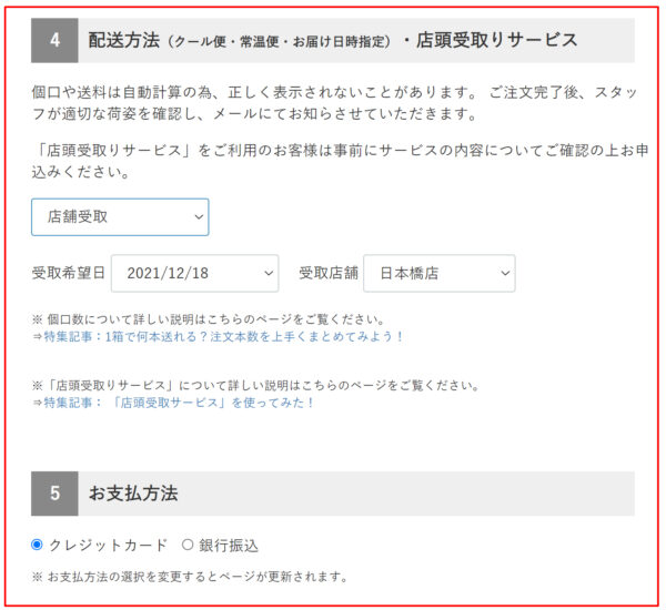 商品をカートに入れ、レジに進んで頂きましたら「ご注文内容のご確認」ページで、(4)店頭受取りサービスの設定(5)お支払方法の設定をお願い致します。お受け取りは【日本橋店】、お受け取り日は【12月18日又は19日】、お支払方法は【クレジットカード】です。