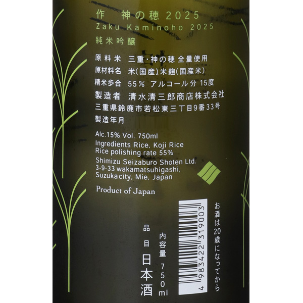 三重県で開発された酒米 神の穂で醸した数量限定商品です。神の国で開発された酒米ということで「神の穂(かみのほ)」と名付けられました。この酒米は旨味が出やすく優しい味わいに仕上がる特徴を存分に活かし、ジューシーで余韻が長く続くエレガントな味わいに仕上がっています。しなやかで繊細、バランスの良い味わいをお楽しみください。蔵紹介