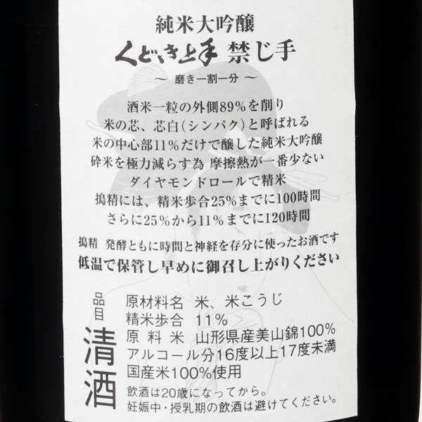 日本酒の製造に関する「禁じ手」には、精米歩合35%以下にすることがあります。こちらはその掟破りの11%精米に挑戦。総米950Kgの「禁じ手」を造るのに、玄米で約145俵を準備し、11%まで精米するのにも約2週間必要となります。手間暇かけた分、酒質は綺麗で上品な仕上がりに。特別な日にもオススメの純米大吟醸酒です。至福のひと時を是非味わってください。蔵紹介