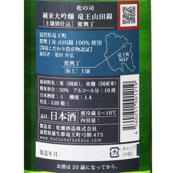 地下120Mの大きな岩盤の下を流れる鈴鹿山系愛知川伏流水を仕込み水とし、100%契約栽培により栽培法を定め十分に審査された酒米を、蔵人が時間をかけて精米。酒に味わいをつける箱麹法による麹造りや、酒質を決める社内保存酵母菌による速醸酒母と、昔ながらの生もと酒母の採用。また、発酵温度を低温に抑えながらも完全発酵を目指す小仕込み(1.2t以下)によるモロミ工程、そして瓶詰貯蔵による低温熟成管理(5℃以下)など、永年の経験による出来る限り丁寧な手造りで、深遠な味わいの「松の司」を醸しだします。(松瀬酒造HPより)
