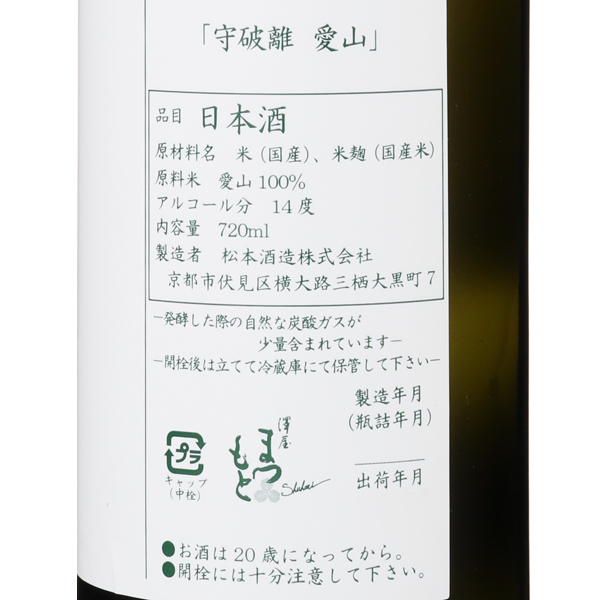 原料に勝る技術は無し!1791年創業。京都市伏見の歴史ある酒蔵で、赤レンガ蔵と八角形の煙突が印象的な酒造蔵は、近代化産業遺産に指定されています。澤屋まつもとのコンセプトは、守破離 (しゅはり) 。澤屋まつもとの伝統を守ること。伝統を破り、他で学んだことを実践すること。守と破を大切に、そこから離れて新たな価値観を見出すこと。京都の酒蔵として、京都の水、良質な米の旨みを表現。透明感、旨み、爽やかさ、シンプルな中に、エネルギーを感じられるお酒です。