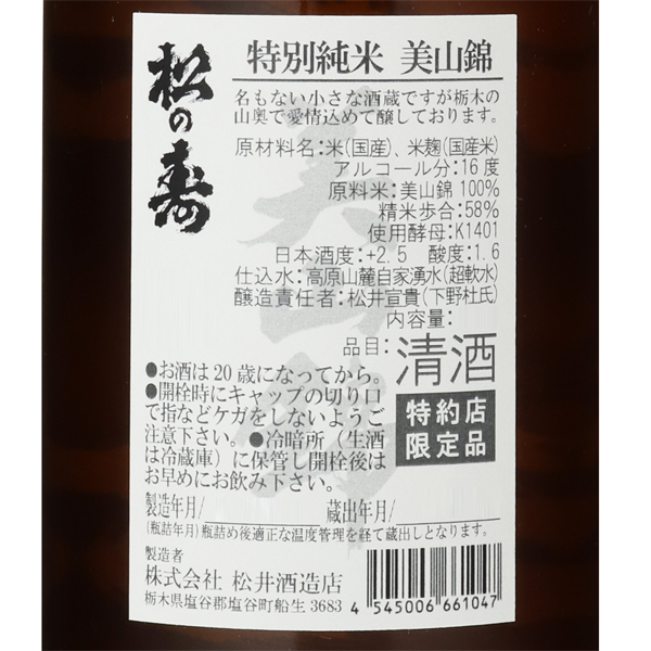 日常に寄り添い、思い出を共有できるお酒でありたい1865年、慶応元年創業。近年の杜氏の高齢化、及び人口減少を見越し蔵元自らが酒造りの修行を積み、平成18年に初代下野杜氏として認定されました。蔵元杜氏として、社長である松井宣貴氏が日々丹精込めて酒を仕込んでいます。裏山から湧き出る超軟水の湧き水で一滴一滴愛情込めて仕込んだお酒は、優しく上品で繊細な味わいに仕上がります。日本では最上級を意味する「松」と「寿」二つのおめでたい言葉が重なる銘柄「松の寿」。是非ハレの日にお選び頂きたい日本酒です。