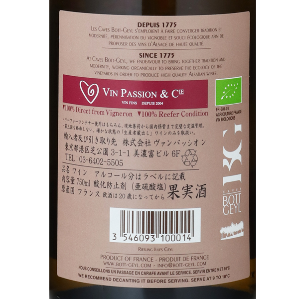 200年以上続いた家族の至宝ボット・ゲイルの前身「ジュール・ゲイル」へのオマージュ。 オーガニック栽培を10年以上行ってきた契約農家とともに、妥協なき造りを行うカーヴ・ド・ボット・ゲイルのドメーヌのあるベブレンハイム村の南10キロ、コルマールに程近いヴェットルスハイム村でオーガニック栽培を行う契約農家の葡萄を使用。 粘土質石灰岩土壌ステンレスタンクで5 ヶ月かけてゆっくりと発酵させ、更にシュール・リーで約 5ヶ月熟成後、瓶詰めしました。太陽の恵みを感じる葡萄の高い成熟度で濃い色調のゴールドイエロー。完熟した黄リンゴ、洋梨に加え、花の蜜、菩提樹等のフローラルなニュアンスもある複雑な香り。 味わいは、ほのかな甘み、バランスのとれた伸びのある酸味、余韻に心地よいミネラル感が続き、全体を引き締めています。アルザスという北部のワインの名醸地でありながら、南の暖かさを感じさせるリースリングです。
