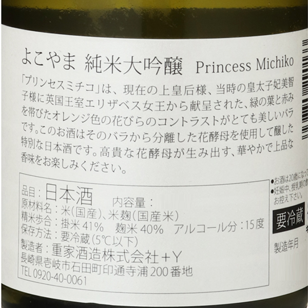 プリンセスミチコは現在の上皇后様、当時の皇太子妃美智子様に英国王室エリザベス女王から献呈された、緑の葉と赤みを帯びたオレンジ色の花びらのコントラストがとても美しいバラです。このお酒はそのバラから分離した花酵母を使用して醸した特別な日本酒です。高貴な花酵母が生み出す、華やかで上品な香味、滑らかで優しい甘味に仕上がりました。よく冷やして、ワイングラスの様な大ぶりなグラスでお楽しみください。蔵紹介