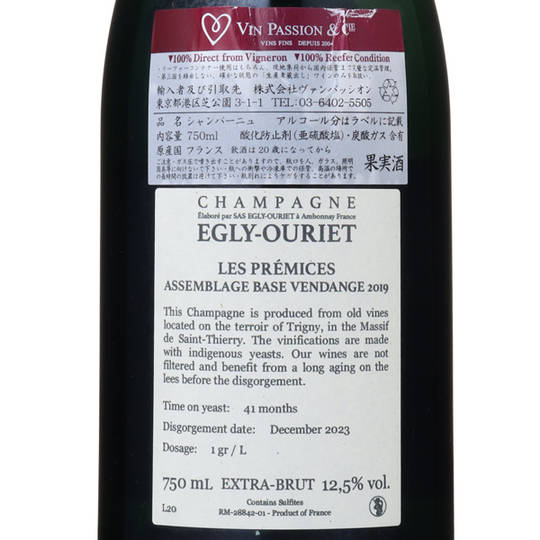 始まりの時を意味する「Les Premices」、エグリ・ウーリエの世界への新たな扉を開く、プレミアムなエントリー・キュヴェです。 ピノ・ノワール、シャルドネ、ピノ・ムニエを各1/3ブレンド。ヴィーニュ・ド・ヴリニィ同様、フランシス氏の妻の実家から相続された、ランス東側のトリニー村の畑から収穫しました。価格も手頃で凝縮した品のある酸があり、エントリーにはピッタリです。香りはフローラルで柔らか、トーストやナッツの香ばしさがあり、フレッシュさと共存。質感はシルキーで柔らかく近づきやすい、ミネラル感と酸のフィニッシュが細く続きます。平均樹齢40年。2016年より造り始め、本キュヴェは23年デゴルジュマン、2019年の葡萄を50%、2018年を30%、2017年を20%使用。42カ月間もの長い間瓶熟成を行い、ドザージュ1.0g/L。