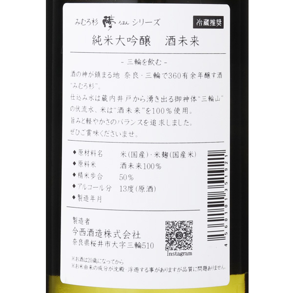 酒の神に見守られ醸されるお酒。酒の神が鎮まる日本最古の神社大神神社、その御神体である三輪山、日本最古の杜氏が祀られる活日神社のある三輪の地に蔵はあります。古の時代より深く結び付いてきた神、三輪、酒。その、他にはない歴史、風土、文化をバックボーンとして生まれたのがみむろ杉です。350年以上に渡って続くこの銘柄を現在支えるのは若手蔵元今西将之さんと、平均年齢20代の若いスタッフたち。