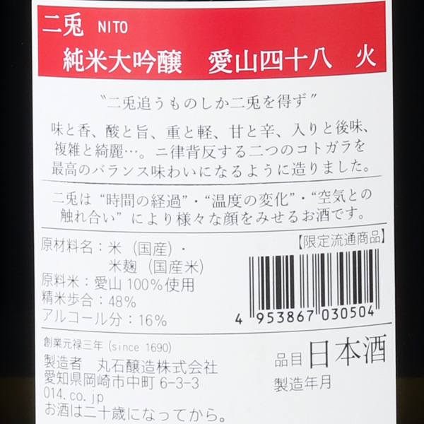 成長を続ける「二羽の兎」1690年に創業の老舗蔵。蔵の代表銘柄「二兎」は”二兎追うものしか二兎を得ず″という考えより名付けられました。「味」と「香」、「酸」と「旨」、「重」と「軽」、「甘」と「辛」の様に反する二つの事柄が生む最高のバランス・味わいを求めて酒を仕込んでいます。原料米は種類は多く使わず、全国的にも使われている「山田錦」と「雄町」がメイン。古くより酸と甘さにこだわり日本酒を育ててきた丸石醸造が、 自らのベクトルで独自の表現ができるよう追求しています。また近年は「萬歳」という米を地元岡崎で復刻させ、使用する原料米に加えました。