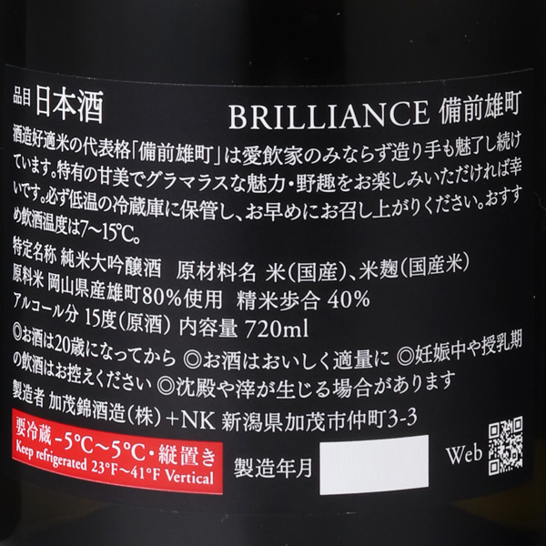 高品質で高精白米を追及するBRILLANCE シリーズ。岡山県産の備前雄町を40%まで磨きました。備前雄町は愛飲家のみならず造り手も魅了し続けています。雄町ならではの個性である野趣あふれる味わいとボリューム感のある飲み応えをお楽しみください。蔵元おすすめ飲酒温度は7〜15度です。