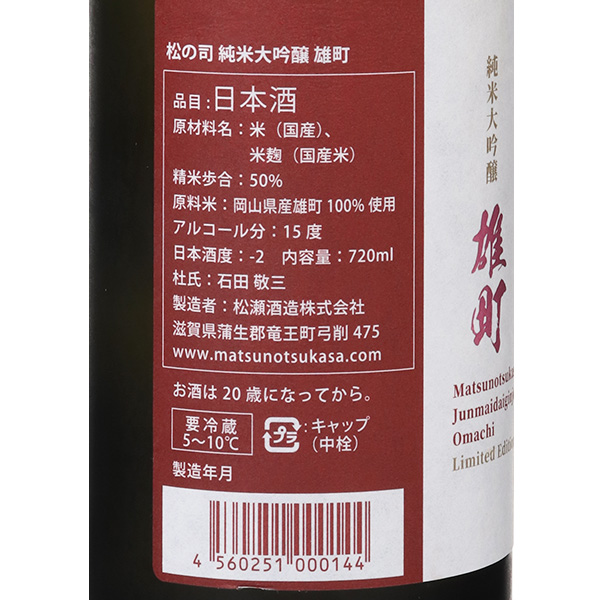 地下120Mの大きな岩盤の下を流れる鈴鹿山系愛知川伏流水を仕込み水とし、100%契約栽培により栽培法を定め十分に審査された酒米を、蔵人が時間をかけて精米。酒に味わいをつける箱麹法による麹造りや、酒質を決める社内保存酵母菌による速醸酒母と、昔ながらの生もと酒母の採用。また、発酵温度を低温に抑えながらも完全発酵を目指す小仕込み(1.2t以下)によるモロミ工程、そして瓶詰貯蔵による低温熟成管理(5℃以下)など、永年の経験による出来る限り丁寧な手造りで、深遠な味わいの「松の司」を醸しだします。(松瀬酒造HPより)