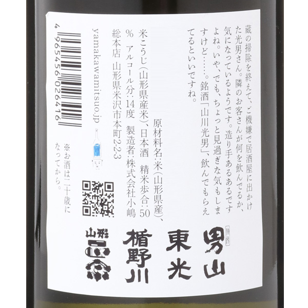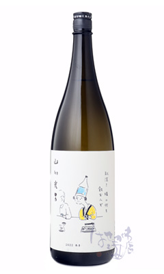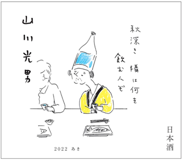 2022年の山川光男は俳句シリーズです。「奥の細道」の作者である俳諧師・松尾芭蕉へのオマージュ作品第三弾は、秋の名句「秋深き 隣は何を する人ぞ」をオマージュし、久々に飲みに出た光男さんのコミカルな場面が描かれています。山形県産 出羽燦々で醸したアルコール度数14度原酒です。小嶋総本店が取り組む酒四段を活用し、軽快ながらも複雑な味わいに仕上がっています。「秋深き 隣は何を 飲む人ぞ」