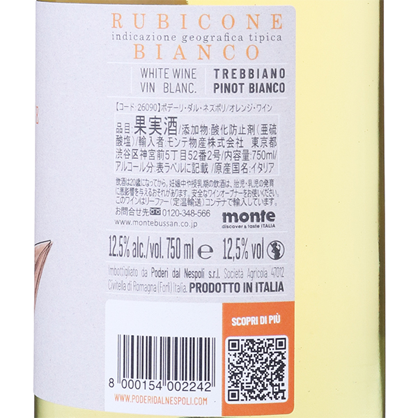 「テロワールそのものの再現」を目的とした、ポデーリ・ダル・ネスポリ社によるナチュラル・ワイン造り。白ブドウを果皮ごと醸す赤ワインと同じ醸造工程で造られるオレンジワインは、同社が丁寧に育て上げたロマーニャ産のブドウの旨味を余すところなく感じられる逸品です。ブドウを除梗・破砕後、直ちに約10℃の低温に保たれたステンレスタンクでマセラシオン。その後15~18℃で発酵させ、再びステンレスタンクに戻し、発酵が終わったら圧搾するという、赤ワインと同じ製法で醸造されます。その後、3~6ヶ月ほどシュールリーで熟成します。