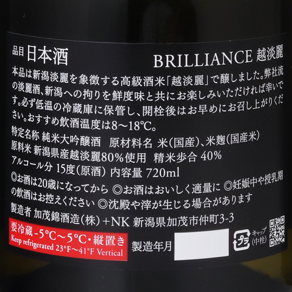 高品質で高精白米を追及するBRILLANCE シリーズ。新潟県農業試験場で開発された当地限定の高級酒米「越淡麗(こしたんれい)」を使用しました。加茂錦ならではの上品な香りと軽快な甘味、加茂錦流の淡麗酒、新潟への拘りをお楽しみください。注意事項
