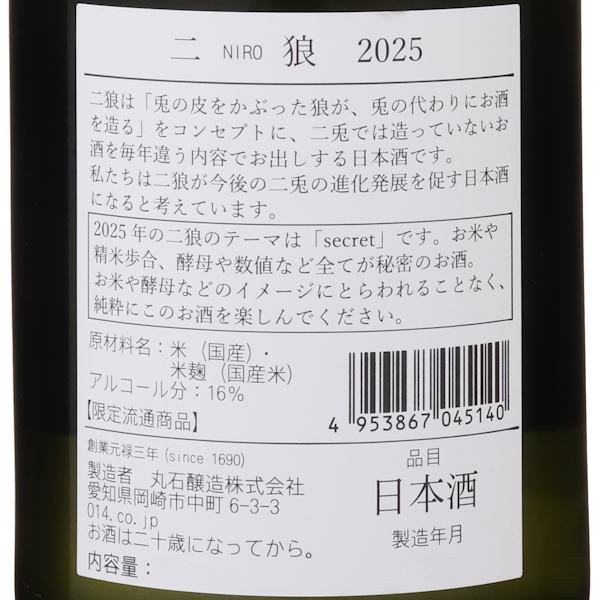 二狼は通常の二兎ではできない酒造りをするお酒で、毎年違うスタイル違う中身のお酒をお届けいたします。「兎の皮をかぶった狼」が兎のふりをしてお酒を造るがコンセプトです。私たちは二狼が今後の二兎の進化発展を促すお酒になると考えています。2025年の「二狼」のテーマは“秘密”。お米・精米歩合・酵母など、すべてが非公開というミステリアスな仕込みです。青リンゴを思わせる香味に加え、やや骨太で辛口なテイスト、そしてほのかな苦味が美しい後味を支えています。甘みや酸味、新鮮さを重視してきた「二兎」とはニュアンスが異なり、「二狼」2025はまた別の楽しみ方ができる一本に仕上がりました。今年の「二狼」が挑む新たな表現を、ぜひ体験してみてください。
