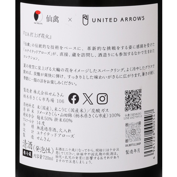 仙禽の伝統的な技術をベースに、ユナイテッドアローズが、蔵を訪問し酒造りにも参加する中で生まれた革新的なコラボレーション。夏の夜空に見上げる大輪の花をイメージしたスパークリング日本酒。今年はうすにごりとなってリニューアル、より味わいに奥行きと膨らみが加わり、リッチなテイストになりました。よく冷やしたグラスで飲めば、炭酸が爽快にはじけ味わいがさらに広がります。一服の涼としてぜひお楽しみください。注意事項