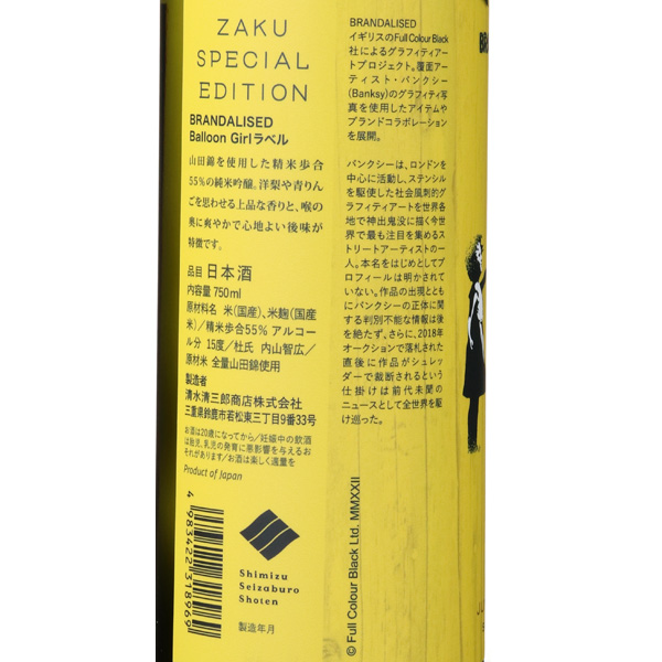 注目!グラフィティアートと作のコラボレーションイギリスの Full Colour Black 社によるグラフィティアートプロジェクトの一環。覆面アーティスト・バンクシー (Banksy) のグラフィティ写真と作のコラボレーションアイテムです。山田錦を使用した精米歩合55%の純米吟醸。洋梨や青りんごを思わせる上品な香りと、喉の奥に爽やかで心地よい後味が特徴です。