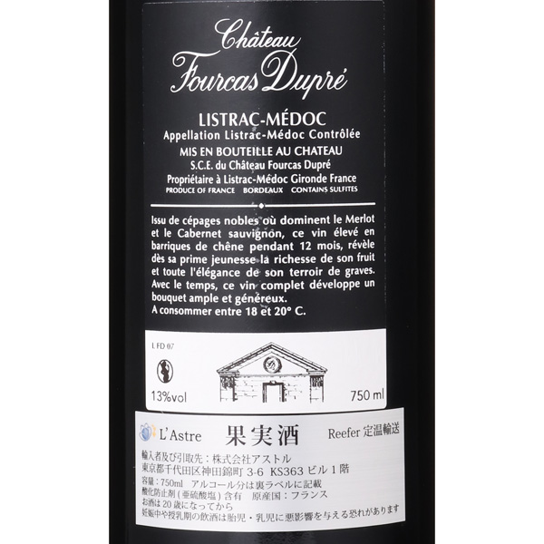 「メドックの屋根」といわれ40メートルを超える標高があるリストラック地区において、18世紀にはブドウが植えられていたという記述のある「フルカス」の地に位置するシャトー・フルカス・デュプレ。元々はクリュ・ルレと呼ばれていましたが1843年にジャン・アントワーヌ・バティスト・デュプレが購入し、現在のシャトー名となりました。