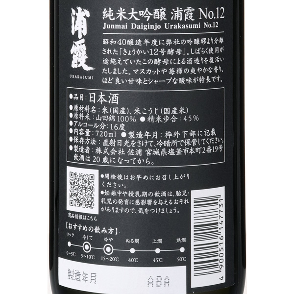 宮城の名工であり南部杜氏でも筆頭格の技能で知られる小野寺邦夫氏が、浦霞伝統の酵母 きょうかい12号で醸した平野流吟醸造りの新たな頁を切り開く純米大吟醸No.12が数量限定でリリースします。山田錦を精米歩合45%まで磨き、低温でじっくりと醸しました。マスカットやイチゴのような爽やかな香り、ほど良い甘味とシャープな酸味が特徴です。