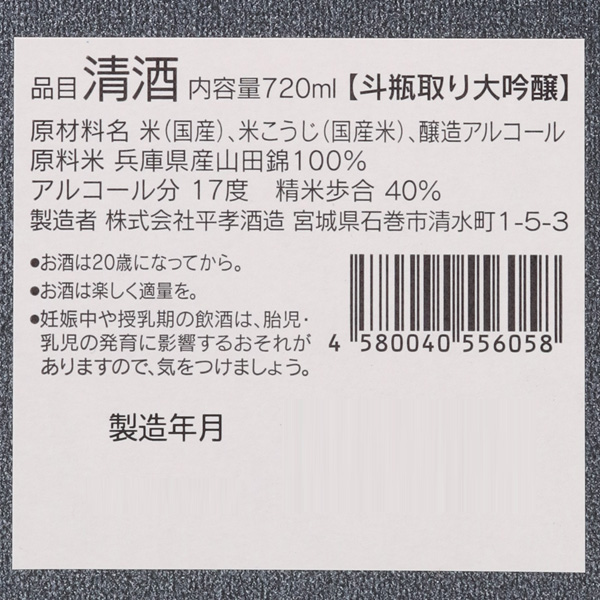 兵庫県特A地区(旧吉川町)の特等米以上の山田錦のみを40%まで磨き製成。鑑評会出品酒に準じた、吊るし斗瓶取り大吟醸。袋吊るし上槽のため少量製品化。アルコール度数高めながらも、清涼なのどごしで後味がスッキリとしたキレが良い逸品です。ネーミングの勝色は日本に古くからある藍色の事で、布を搗く染めの手法を用いて濃く染めたことが名前の由来となっています。鎌倉時代には、武士の服や武具を勝色で染め、勝ち戦になるよう縁起をかついだそうです。注意事項