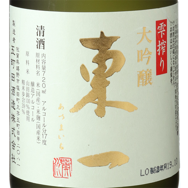 日本酒ブームの先駆け的な蔵元。大正11年、1922年創業。佐賀県の南西部、佐賀県嬉野市塩田町に蔵はあります。最近では、自社で酒米を栽培している蔵は少なくありませんが、それにいち早く取り組んでいる蔵です。人、米、造りが一体となって醸す代表銘柄「東一」は、日本酒ブームのきっかけを作ったと言われています。さらに、多くの酒造関係者が師と仰ぐ、松本酒造特別顧問、京都電子工業の技術顧問・勝木慶一郎氏が長年製造責任者を務めていたことでも有名です。各スペックで色々な味わいをのぞかせる「東一」。是非飲んで頂きたい商品です。