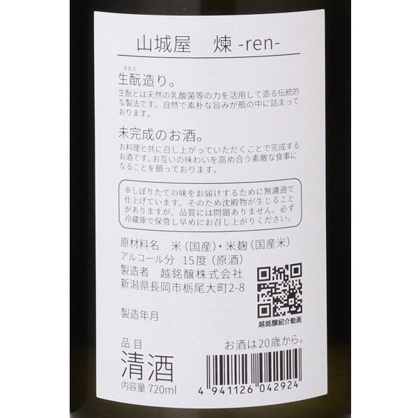 搾ったばかりのそのままの味わいを瓶に閉じ込めています。例年より一層クリアな酒質に仕上がり、飲むたびにスッと体に染み渡る、米の旨味をたっぷり含んだお酒に仕上がりました。雑味を感じさせないクリアな飲み口と、程よい酸味と後味のビター感が舌の上で余韻を残し、次の一杯を誘います。立ち香はバナナやパイナップルに似た甘やかな吟醸香。キレのある辛口の中に、心地よい甘味がほんのりと広がり、深みのある味わいに仕上がっています。これからの冬にかけて脂がのってくる鰤やアンコウ、鱈、真牡蠣などの食材との相性がよく、食材を引き立て、飲み合わせる事で旨味が増し、フィニッシュには口の中を洗い流し、リセットしてくれる作用を持ち合わせたお酒です。主に鉄などの鉱物を熱して不純物を取り除く、鍛える、品質を高める、良質なものにする、などの意味を持ちますが、これになぞらえて、燃えるような情熱を酒造りに注ぎ込み、良質で洗練された酒になることを願って「煉」と名付けられました。