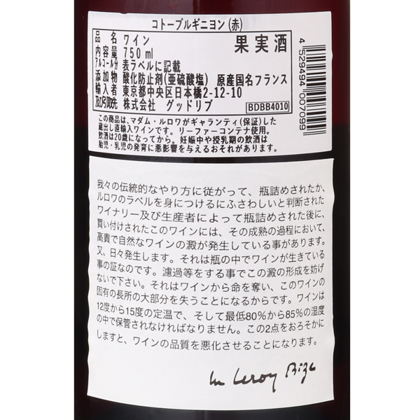 メゾンワインは、マダム・ルロワの厳しいテイスティングによるチェックの上で買い求めた良質のワインを、自社で熟成させ、出荷しているワインです。飲みごろを迎えるまでルロワ社のセラーで熟成させることで、深い味わいのトラディショナルなスタイルのワインとなります。親しみやすいフルーティーなワインで、イチゴやイチジクのような新鮮な果実の風味が心地よい味わいです。蔵紹介