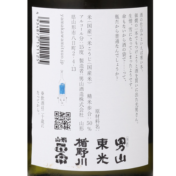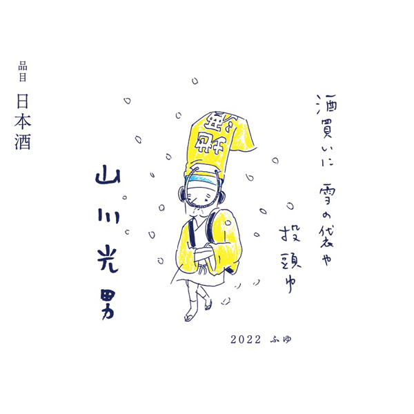 山形県の有志4蔵が合同で酒造りを行うプロジェクト「山川光男」。2022年の山川光男は俳句シリーズです。「奥の細道」の作者である俳諧師・松尾芭蕉へのオマージュ作品、最後を締めくくる第四弾は、「米買いに雪の袋や投げ頭巾」をオマージュし、酒を買いに出た山川光男が急な雪に遭い、酒の袋を頭巾代わりに被っている様です。「酒買いに ゆきの袋や 没頭中」米を買いに「行く」と「雪」をかけて、雪をしのぐ傘もない貧しさをユーモラスに描かれています。