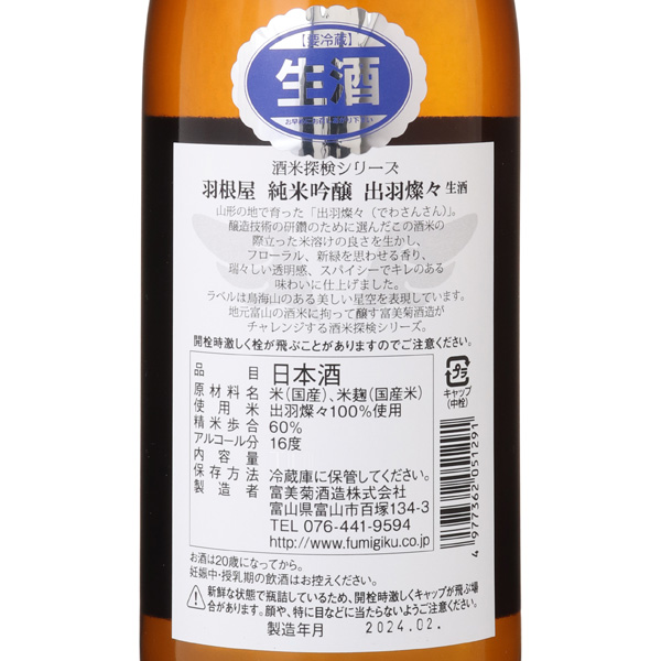 県外の酒造好適米を使用して仕込む「羽根屋 酒米探検シリーズ」。記念すべき第一弾を飾るのは、山形県の酒造好適米 「出羽燦々」。醸造技術研鑽の為に選んだこの酒米の際だった米溶けの良さを生かし、四季醸造としての経験と小仕込みによる丁寧な造りでよい仕上がりになりました。米の特徴である芳醇な香りを持ちながらも東北の冷涼な空気を感じさせるクリアなキレ。優雅な余韻と共に広がるフレッシュなフローラル、新緑を思わせる香りと瑞々しい透明感。後味のスパイシーなキレをお楽しみください。蔵紹介