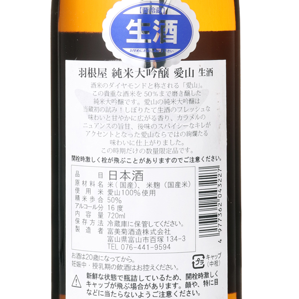 皆様のおいしいのために、蔵元の思いが溶け込んだお酒!大正5年創業。立山連峰の伏流水で主に富山県産の酒米を使用し、お酒を醸しています。5代目を継ぐ羽根敬喜さんが目指すのは飲めば自然と(蔵元の思いが)伝わる味。造りにおいては、すべてのお酒を大吟醸を醸すのと同じ気持ちで、一つ一つの工程を丁寧に、手間隙を惜しまずに造ることを大切に。近年ではIWC(インターナショナルワインチャレンジ)にてメダルを獲得。また、ANAプレミアムクラス・ビジネスクラスのお酒としても採用されています。