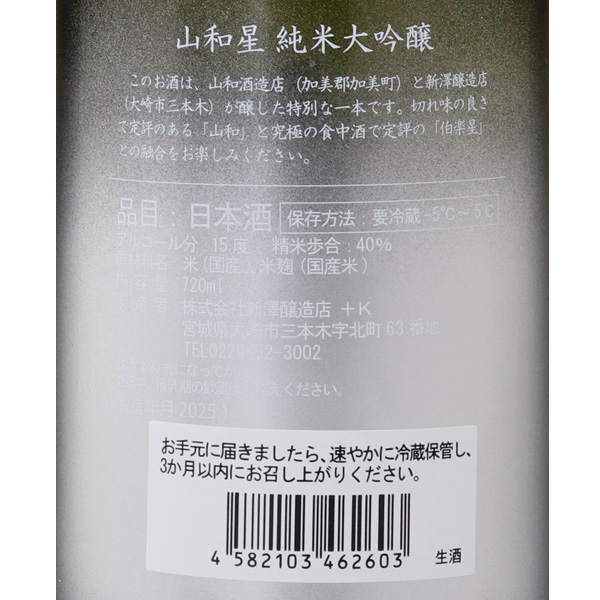 山和酒造店と新澤醸造店のコラボレーション商品。2019年に地元宮城の百貨店の創業200周年記念酒として初めて醸されて以降、初売り商品として毎年造られている新春のお酒です。山和酒造店と新澤醸造店が交代で醸造を担当しており、7年目を迎える今年は新澤醸造店が醸造を担当しています。瑞々しい巨峰のような艶っぽい香りと、軽快で透明感のある綺麗な口当たりが広がります。フレッシュで優しい甘さと心地よい酸味が一体となりさらりと消えていきます。