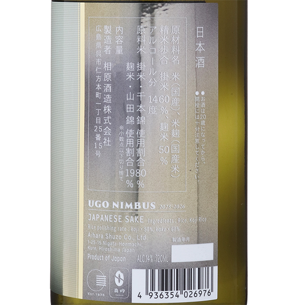 今まで培った技術に新たな感性を加え、より自由な感性でこれからの吟味を追求するUGOシリーズ。NIMBUS(ニンバス)とは神々の周囲を取り巻く光や光輪を意味します。天使の頭についてる輪や光輪です。転じて雲(雪雲・雨雲)という意味もあり、冬空の薄明光線・日暈みたいな透明感のあるイメージが重なり命名されました。和梨、晩白柚(ばんぺいゆ)を思わせる果実香とジューシーなアタック。瑞々しさと上品な甘みのバランスが整っており、柔らかな酸が引き締めるしっとりとした余韻が心地よい一本です。蔵紹介