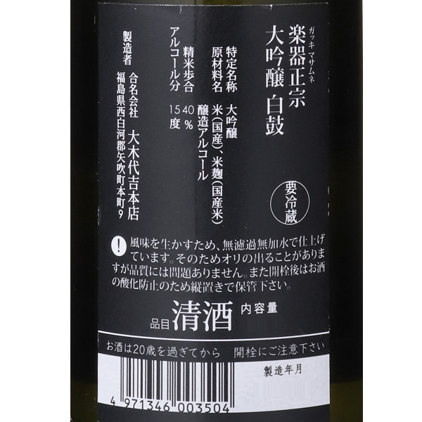 楽器正宗のアルコール添加技法で醸した出品酒スペックの大吟醸です。マスカットやシトラス、ハーブを思わせる爽やかな香りがゆっくりと立ち上がり、和三盆のような上品な甘みを感じる優しい飲み心地で、食事にもしっかりと寄り添うバランスに仕上がっています。蔵紹介
