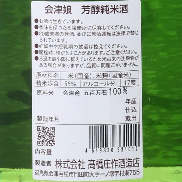 ひとつの田んぼから ひとつの商品をつくる2018年、会津若松市は戊辰150年を迎えました。高橋庄作酒造店が酒造りをはじめたのは明治はじめ、戊辰戦争後まもなくのことと伝え聞いています。以後今日まで、この会津と風と土の薫りを味わいのなかに表現したいと『土産土法(どさんどほう)の酒造り』に取り組んできました。会津娘では、会津の酒造好適米だけ造る純米酒を基本として2019年より、「一つの田んぼでとれた米ごとに仕込む純米吟醸酒」を酒造りの中心に据えて、圃場限定会津娘『穣(じょう)』として、田んぼごと季節ごとに蔵出しをしています。