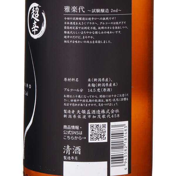 雅楽代シリーズ試験醸造第二弾です。今回の試験醸造は超辛口。日本酒度を大きくプラスへ、グルコースを最大限削ぎ落したタイプです。爽やかなガス感、透明感のあるジューシーな旨味、まろやかな甘みが広がります。超辛口タイプの中にも、雅楽代らしい まろやかさやほんのりとした優しい甘みを融合させた、今の天領盃酒造の技術を全て盛り込んだお酒に仕上がりました。口元のすぼんだグラスで飲んで頂くと、お酒が直線的に口の中に入り、お酒本来の味わいを楽しんでいただけます。食事とも合わせやすく、キレイにリセットするだけでなく、柔らかな膨らみも感じられるので、だらだらのんびり飲むのに最適!蔵元さんおすすめは濃厚なコクのあるペコリーノチーズ。チーズの濃厚さとお酒のほのかな甘味とキレが相性がよく、驚きを隠せなかったそうです。