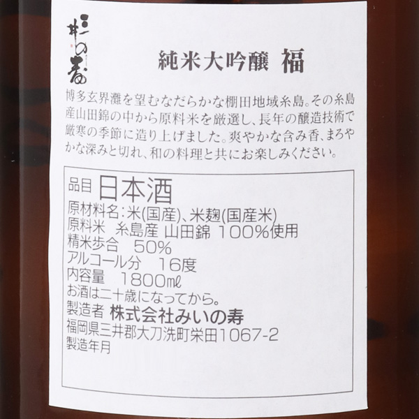 今では当たり前のように造られている純米酒がまだまだ珍しい昭和の時代から醸されている三井の寿 純米大吟醸 福。香りと味のバランスを重視して、福岡県糸島産の山田錦を50%精米し、蔵で培養したオリジナルの酵母で醸しています。その後は蔵の冷蔵庫で貯蔵熟成させ旨味がのったタイミングで出荷しています。飲む直前に室温に戻し、少し冷たい状態で飲んで頂くと米由来の香り、程よいボリュームの旨み、ふくよかさが際立ちます。贈り物としてご購入のお客様へ