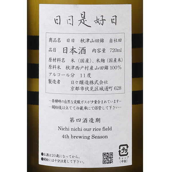秋津地区の西戸村にある自社田で、田おこしから丁寧に育て守ってきた特別な田んぼの山田錦を使用した一本です。契約栽培された村単位の原料米でも十分に他との違いは表現されますが、この自社田は隣り合わせの2枚の田んぼだけの山田錦を専用に仕上げて精米し醸した為、味わいのキメ細やかさがより明確に表現されています。ラベルデザインは、手書きではなくダイモテープをはったクラフト感のある仕様になっています。注意事項