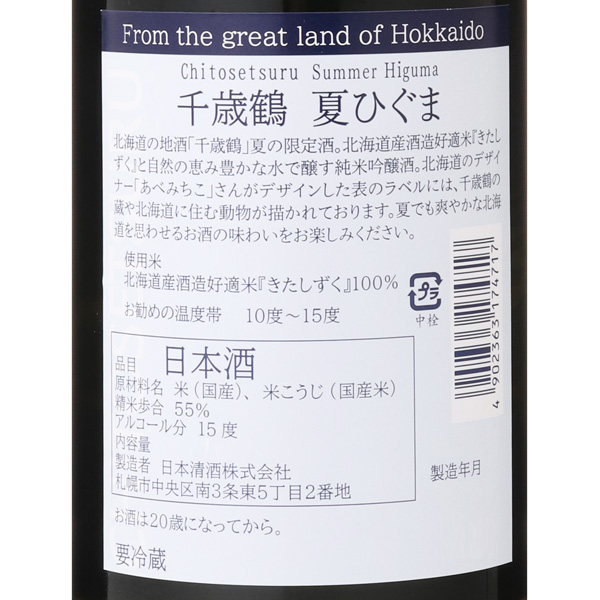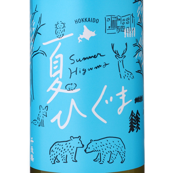 夏の空の澄んだブルーに、北海道の素朴さ、自然の雄大さを象徴したラベルデザインは、旭川在住で旭川動物園のカップ酒のイラストも担当されたイラストレーター・あべみちこさん。夏の間、オスとメスの2頭で過ごすヒグマと、エゾフクロウ、エゾナキウサギ、エゾジカ、キタキツネなど沢山の動物達、エゾ松やポプラ並木、防風林などの緑豊かな森林、2023年4月に完成した千歳鶴の新蔵も描かれています。