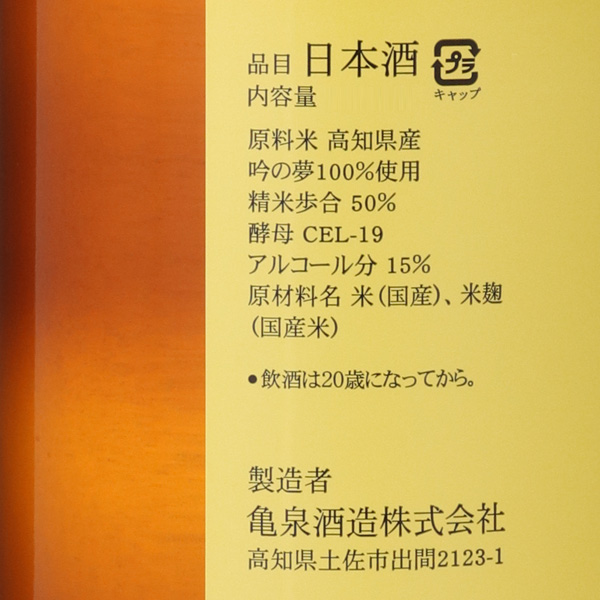 高知県産 吟の夢を50%精米し、高知酵母 CEL-19を使用し醸しました。リンゴや洋ナシの香りと共に、フレッシュな酸味や苦味のバランスの良さが光る後味に仕上がっています。食中酒として、和食との相性がよく、特に魚介類の刺身や焼魚などと一緒にご堪能下さい。受賞歴