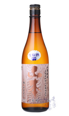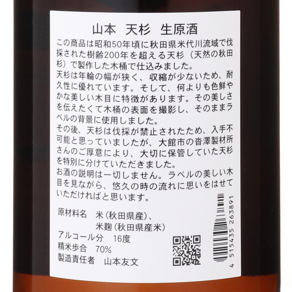 現在では伐採が禁止されている天然の秋田杉、樹齢200年を超える天然の秋田杉(天杉)で作られた木桶で仕込んだ山廃純米の生原酒です。天然の秋田杉は年輪の幅が狭く、収縮が少ないため耐久性に優れており、色鮮やかな美しい木目に特徴があります。その美しさを伝えるため、木桶の表面を撮影しそのままラベルの背景に使用。このラベルを眺めながら、樹齢200年の天杉に想いを馳せる、そんな飲み方が似合う一本です。火入と違い生原酒のフレッシュでより力強い味わいをお楽しみください。