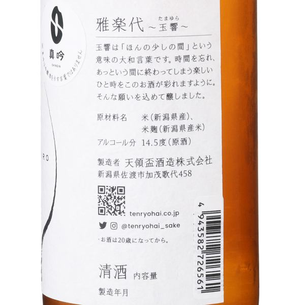 玉響(たまゆら)とは、まが玉とまが玉がカチっとぶつかる瞬間の音が語源で、 ぶつかる刹那の時間「一瞬の時間、あっという間の時間」という意味の大和言葉です。雅楽代 玉響は「一瞬の時間、あっという間の楽しいひとときを過ごしてもらえるようなお酒」 をコンセプトに、雅楽代シリーズでは一番甘みのボリュームを強めています。 口に含んだ時の一瞬のインパクト、一瞬のきらめきを感じてもらえられるようなぽってりとした甘みのある酒質を目指しているお酒です。今回は真吟精米したお米を使用しています。真吟とは米の厚さ方向を削ることで、米表面に多く分布されるタンパク質を効率よく削ることが可能な精米方法で、扁平精米とも言われています。今回の玉響はいつもの玉響と違います!普段の雅楽代シリーズのお酒は常温に近づくにつれ柔らかさが増していくのですが、冷蔵庫から出したばかりですと舌に弾けるガス感と共にメロン、マスカットのような香りがきれいに広がります。温度が上がるにつれてシャープな酸が引き立ち、パイナップルのような芳醇な香りと、ジューシーな甘味が全体をまとめます。お好みの温度帯を探してみてください。
