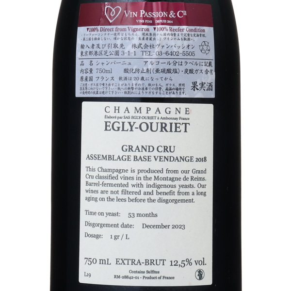 無農薬に近い栽培と最新の醸造設備を得て進化を遂げるエグリ・ウーリエ極上のスタンダード・キュヴェです。ピノ・ノワール70%、シャルドネ30%アンボネイの南向きの緩やかな斜面に植樹された、樹齢40年超のピノ・ノワールを中心に、東向き斜面のシャルドネをブレンドしました。プレスは冷却システムを備える最新式のコカールプレスで3時間かけてゆっくりと優しく絞った後24時間静置し、自然な澱落としを行います。自然酵母のみを使用し、2~3度という低温で2~3カ月間アルコール発酵を行い、その後マロラクティック醗酵やバトナージュをせず、澱に寝かせたまま12か月間熟成させています。濾過、清澄も一切行わず、美しい酸と厚みのある力強い酒質、バランスに優れたシャンパーニュです。リザーヴワインを50%以上ブレンド。ドザージュ1.0g/L、本キュヴェは「2018年」の葡萄主体。(23年デゴルジュマン:2018年の葡萄を60%、2017年を20%、2016年を20%)