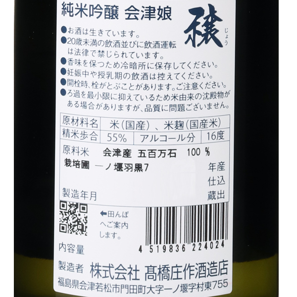 ひとつの田んぼから ひとつの商品をつくる2018年、会津若松市は戊辰150年を迎えました。高橋庄作酒造店が酒造りをはじめたのは明治はじめ、戊辰戦争後まもなくのことと伝え聞いています。以後今日まで、この会津と風と土の薫りを味わいのなかに表現したいと『土産土法(どさんどほう)の酒造り』に取り組んできました。会津娘では、会津の酒造好適米だけ造る純米酒を基本として2019年より、「一つの田んぼでとれた米ごとに仕込む純米吟醸酒」を酒造りの中心に据えて、圃場限定会津娘『穣(じょう)』として、田んぼごと季節ごとに蔵出しをしています。