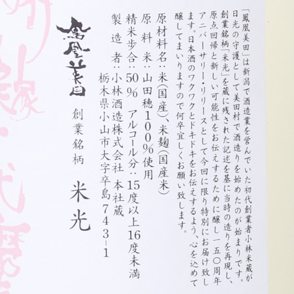 鳳凰美田は、新潟で酒造業を営んでいた初代創業者 小林米蔵 が江戸時代 徳川家により招致され日光(東照宮)の守護として日光の入口である例幣使街道(れいへいしかいどう)の美田村で酒造りを始めたのが始まりです。原料米には栽培履歴があった徳川家「鳥居米(壬生米)」からの流れとなる「山田錦」の原品種である父方「渡舟」と母方「山田穂」を使用し醸すことで、「鳳凰美田」の起源と歴史を100年以上の時を経た今の「鳳凰美田」が醸す New Origin を皆様と一緒にお伝え致します。